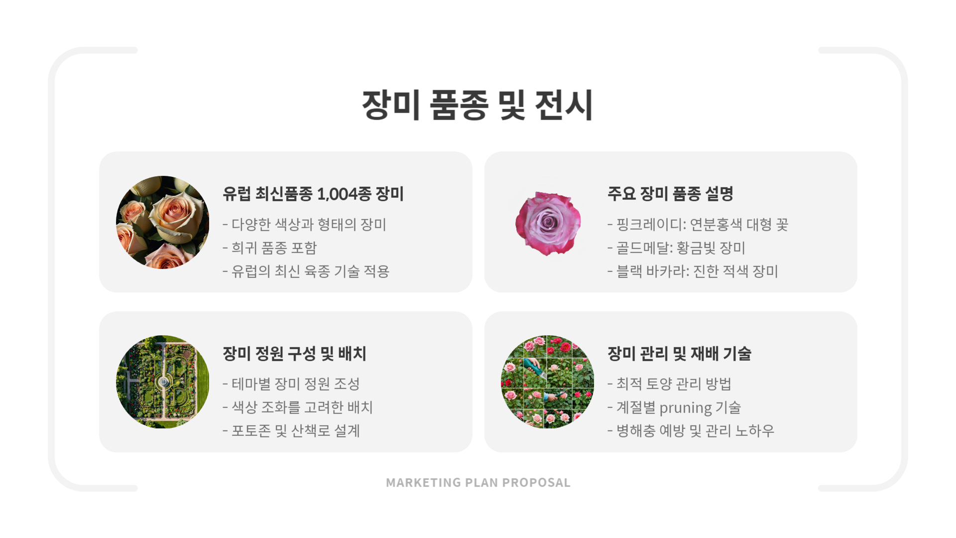 🌹 프랑스, 영국, 독일, 일본, 미국 등지에서 수입한 1,004종 이상의 장미들이 정원처럼 꾸며진 테마별 구역에서 감상할 수 있습니다.