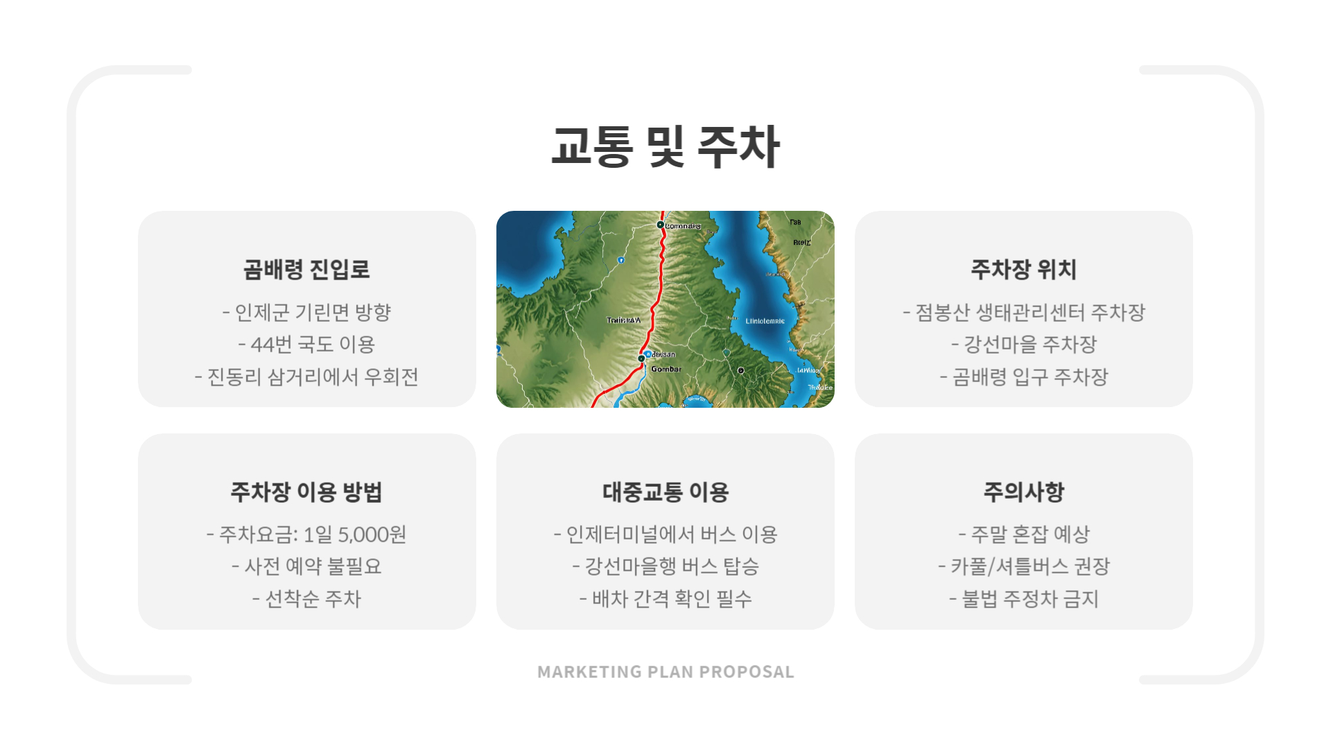 - 대중교통: 인제버스터미널 하차 → 기린면행 버스 탑승 → 하차 후 도보 또는 택시