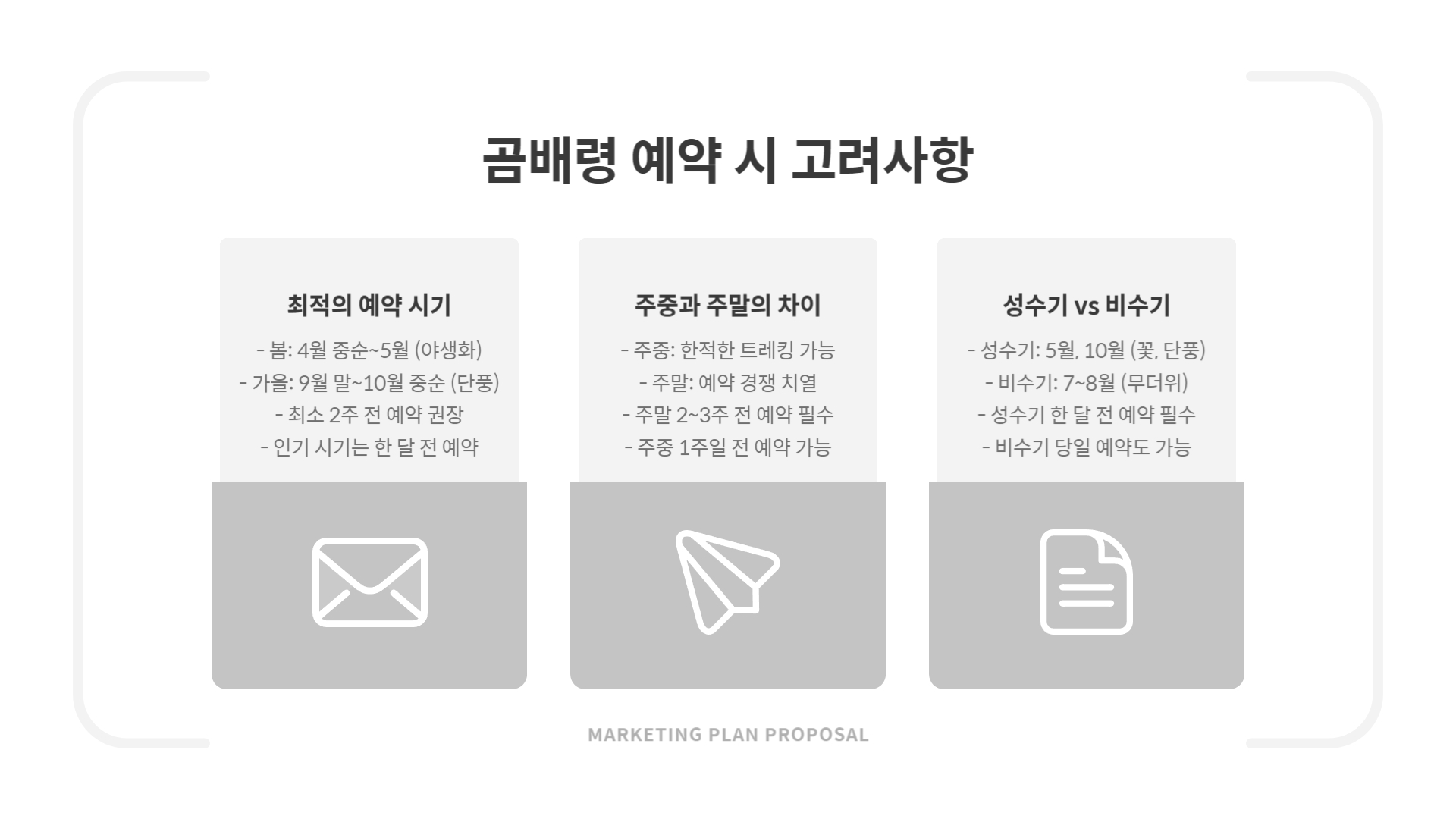 - 주말 예약은 경쟁이 치열하므로 평일 예약을 고려해보세요.