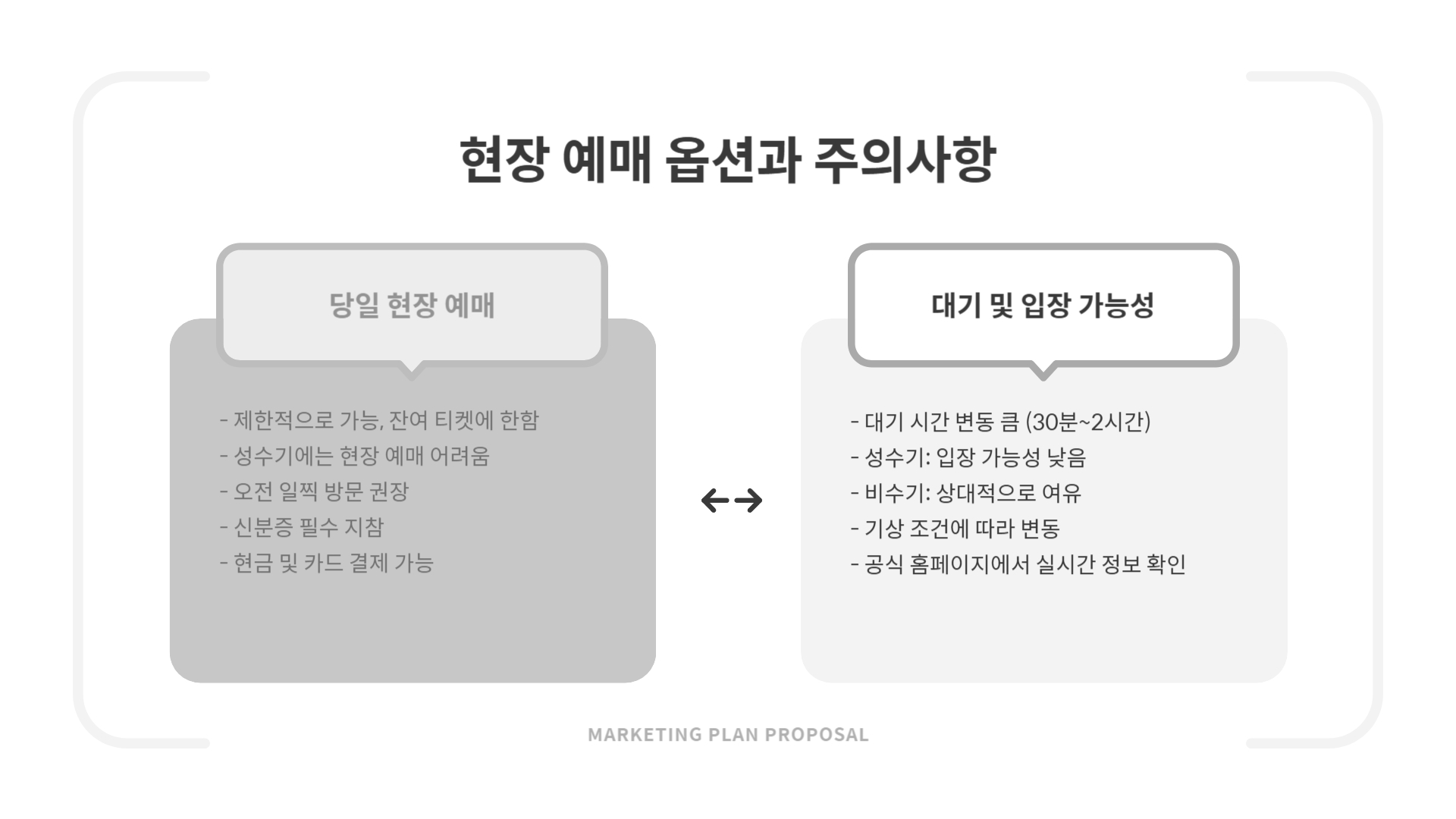 - 현장 잔여 티켓은 극히 제한적, 사전예약이 확실함