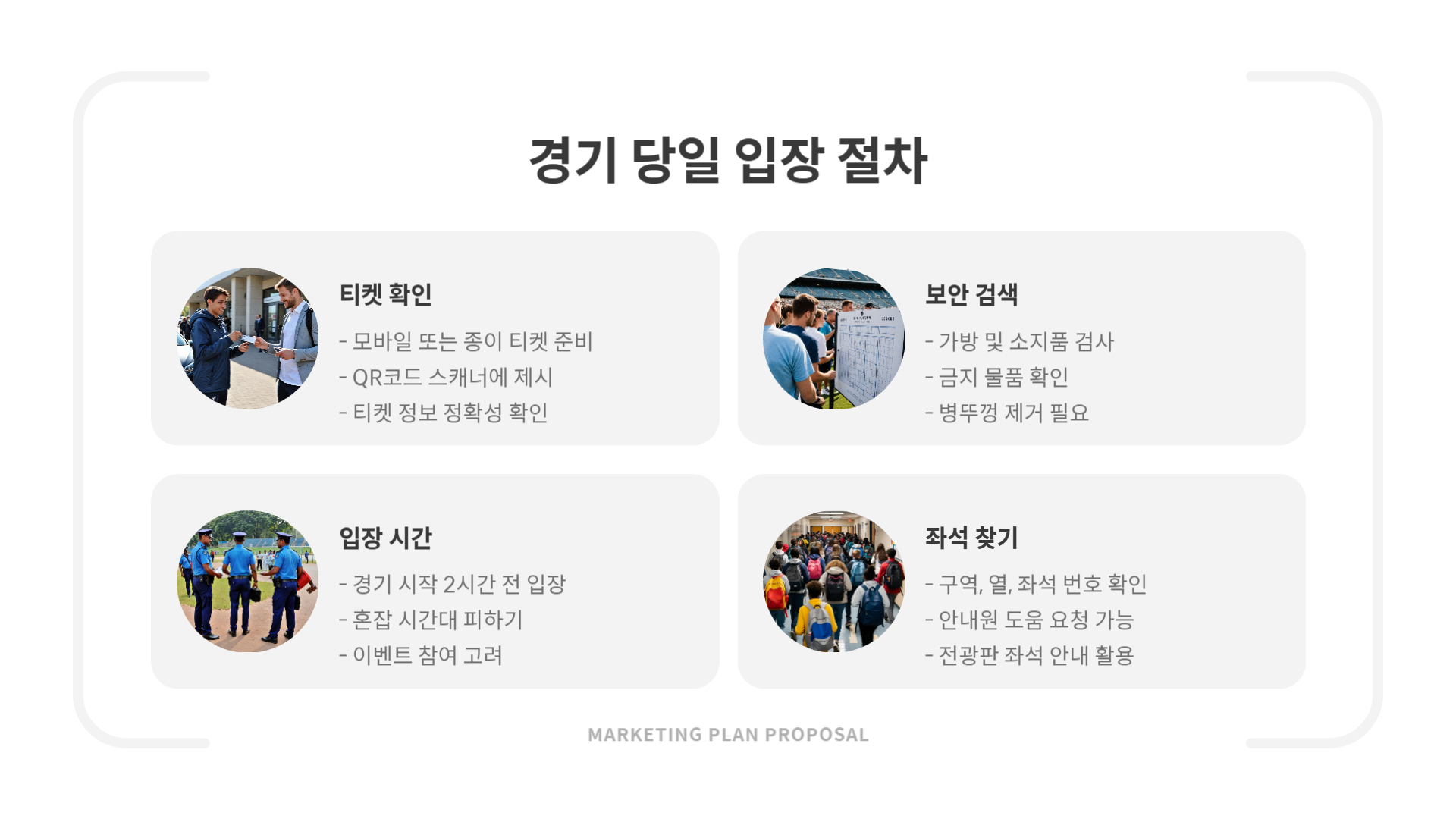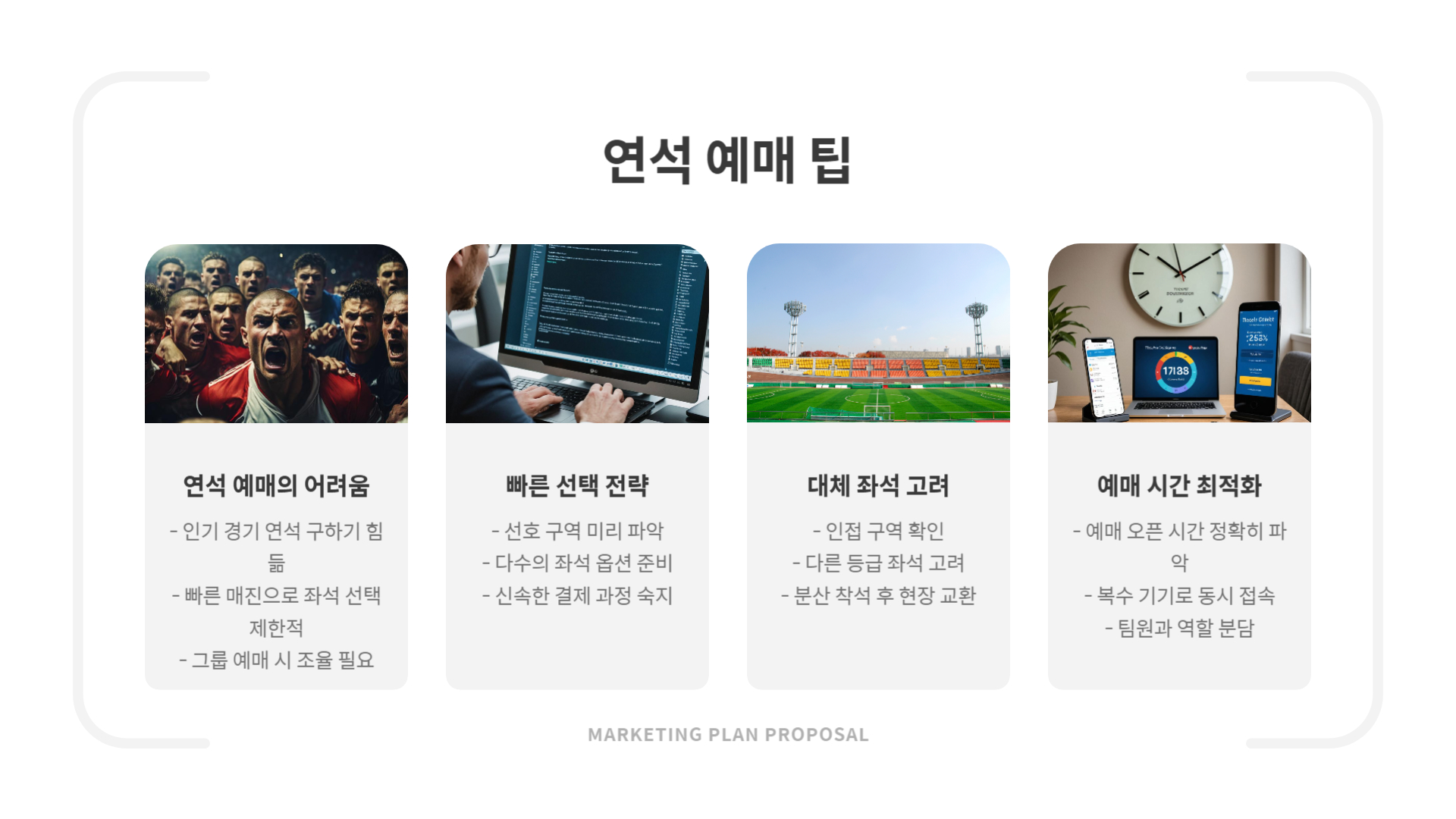 - 조기 예매 필수: 인기 경기일 경우 예매 시작 10분 안에 마감될 수 있어요!