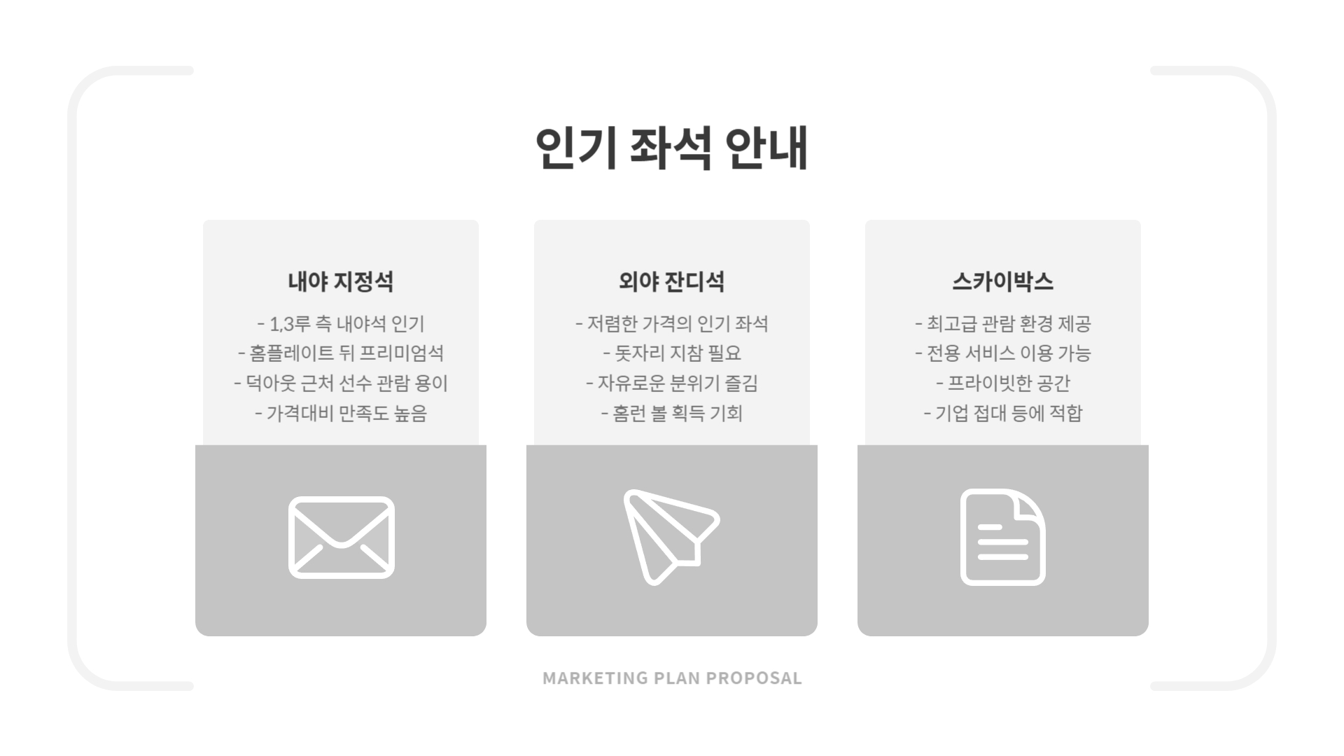 A. 내야지정석 또는 테이블석을 추천드립니다. 편의 시설 접근이 좋습니다.