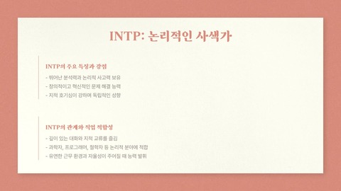 - INTP–ENFP : 분석가 vs 자유로운 영혼 → 깊이 있는 대화와 유연한 관계 형성