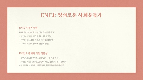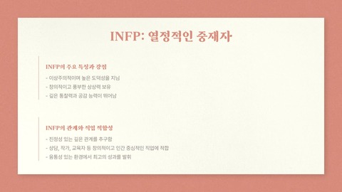 - INFP–ENTJ : 감성적 이상주의자 vs 논리적 리더 → 서로 부족한 부분을 보완
