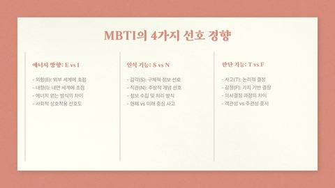 | 판단 방식 | 사고(Thinking) vs 감정(Feeling) | T / F |